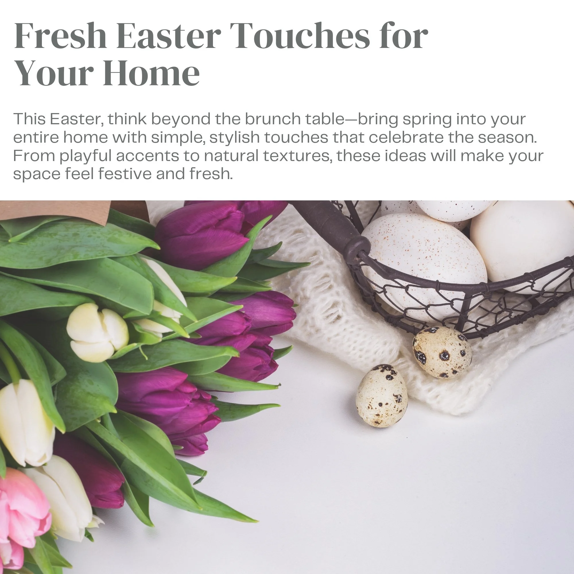 Add seasonal flowers in unexpected places—think a small arrangement on your entryway table, a vase of tulips on the coffee table, or a mini bouquet in the bathroom. Fresh flowers and plants instantly brighten a room and set a cheerful Easter tone. Shop real arrangements here.